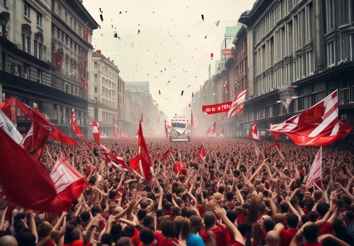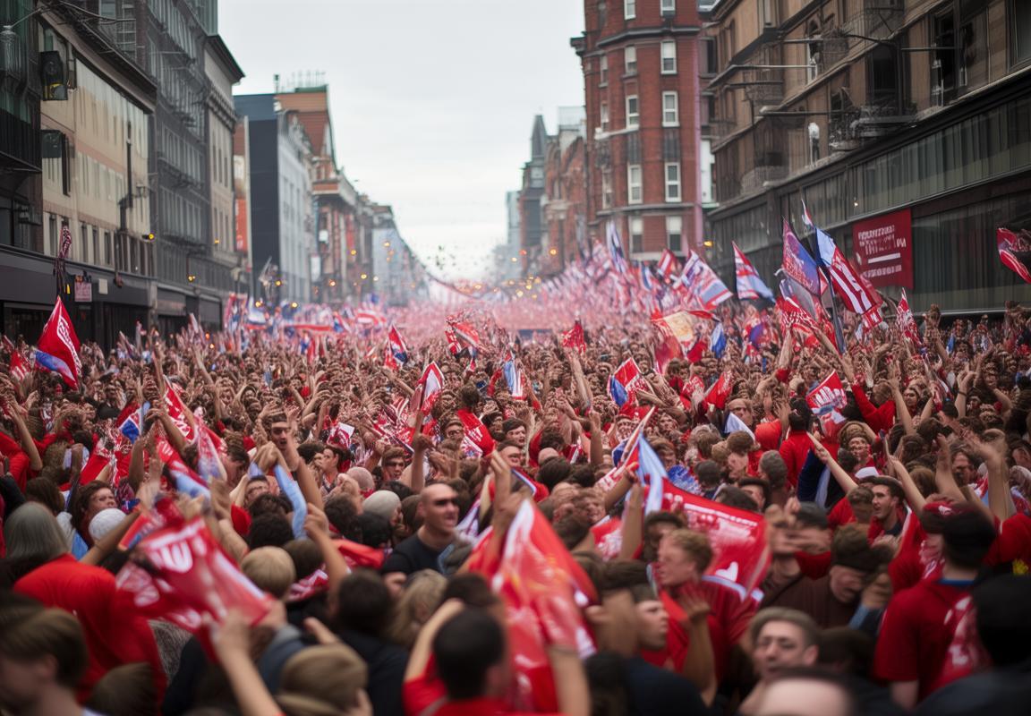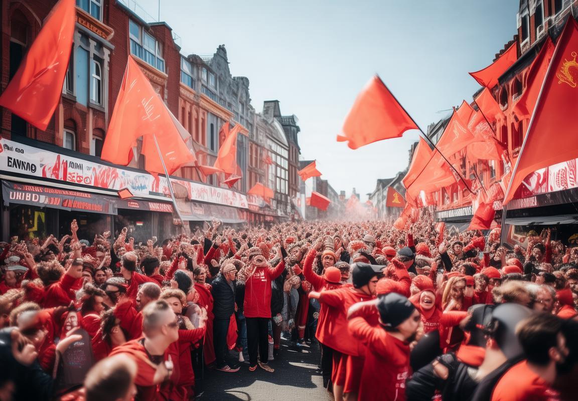 街头巷尾,彩旗飘扬,红蓝相间的利物浦队旗在风中猎猎作响。球迷们身着球队的标志性红色球衣,脸上洋溢着胜利的喜悦,他们的笑声、歌声和掌声此起彼伏,形成了一曲欢快的交响乐。